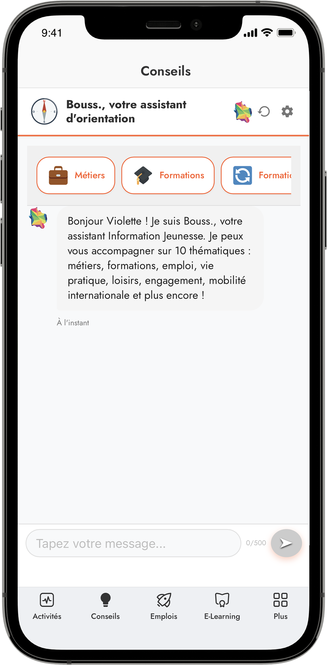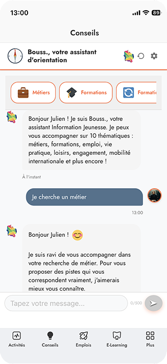 Discutez avec Bouss., notre assistant disponible 24h/24. Posez vos questions sur les métiers, formations, santé… et recevez des réponses personnalisées adaptées à votre situation.